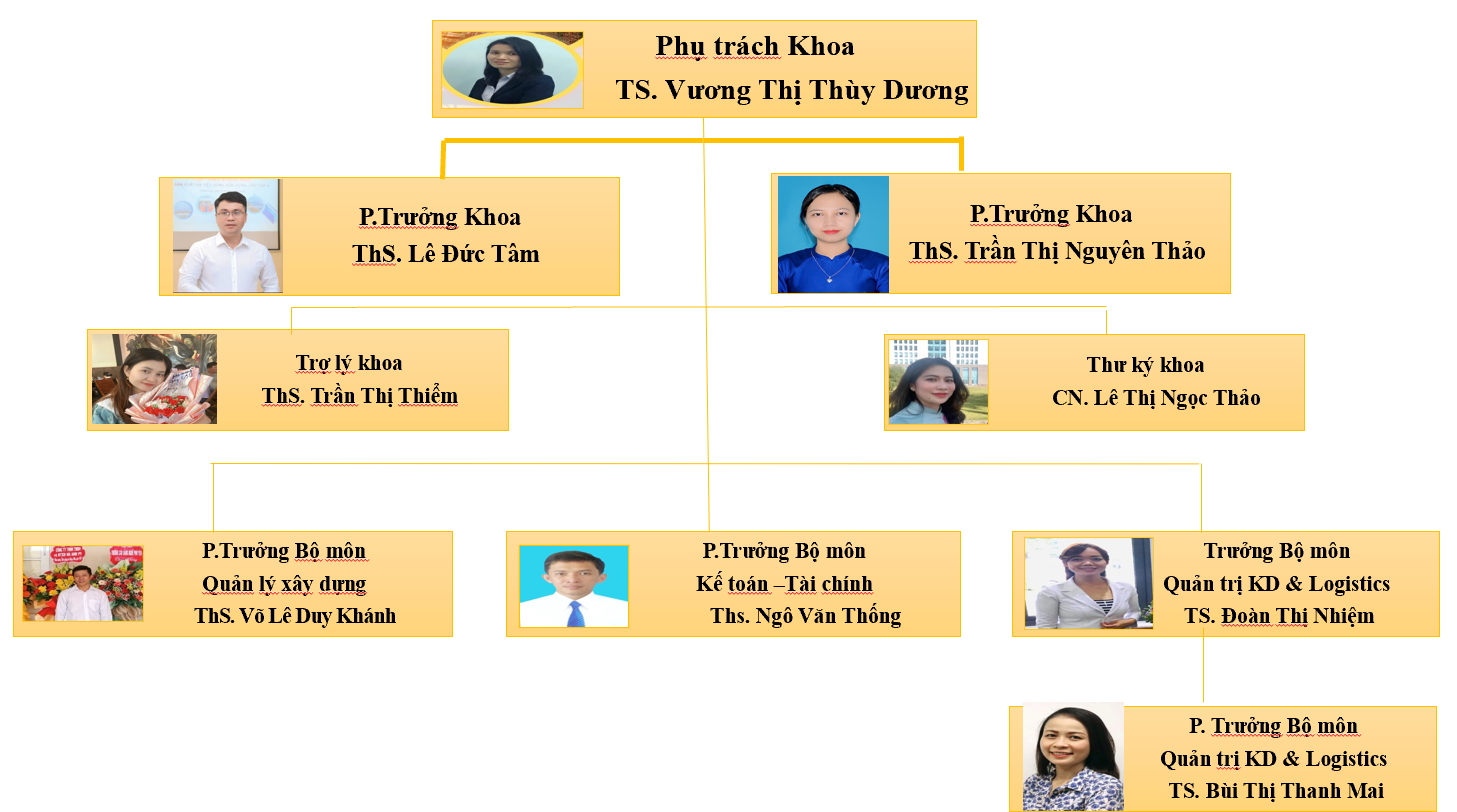 Khoa hiện nay có 01 Chi bộ Đảng, 03 bộ môn gồm: Bộ môn Kế toán - Tài chính, Bộ môn Quản lý xây dựng và Bộ môn Quản trị kinh doanh và Logistics, hiện đào tạo với 07 ngành, bao gồm: