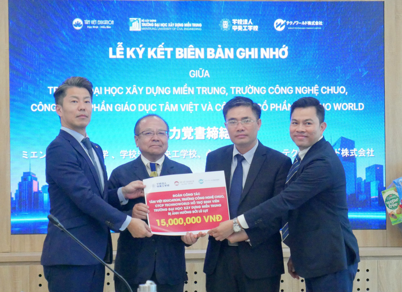 Nhân dịp này, Tâm Việt Education, Trường Công Nghệ Chuo và Công ty Techno World (Nhật Bản) đã trao tặng 15.000.000 đồng dành cho các bạn sinh viên MUCE bị ảnh hưởng bởi bão lũ. Đây không chỉ là món quà về vật chất, mà còn là tấm lòng, là sự đồng hành và sẻ chia từ các đơn vị dành cho các bạn – những kỹ sư, kiến trúc sư tương lai đang nỗ lực vượt qua thử thách để tiếp tục hành trình học tập của mình. MUCE xin trân trọng cảm ơn nghĩa cử đầy nhân văn này.